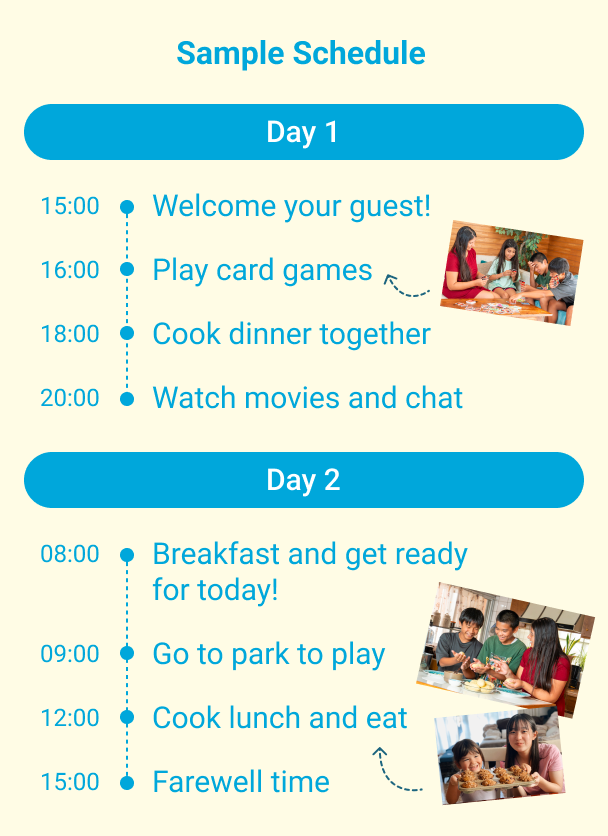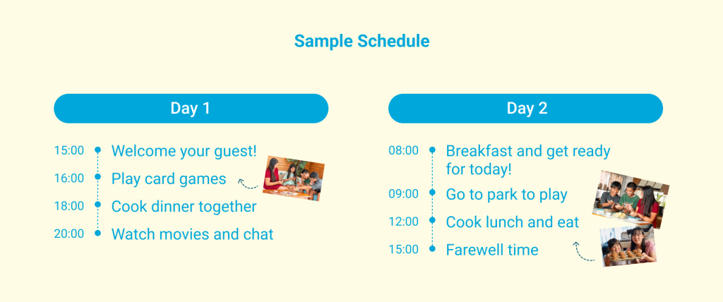 A. You need to share 3 main meals (Breakfast, Lunch and Dinner) with the guests during a 24 hours program. In longer programs, of course we will inform you which meals you need to share with the students in advance so you can prepare for it.